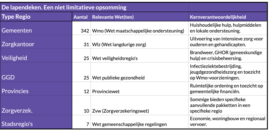 Voor de Wmo klop je aan bij de wethouder, voor de Wlz klop je aan bij een zorgkantoor dat elders zetelt en voor de Zvw onderhandel je met een verzekeraar die jouw regio als "prioriteitsgebied" (of juist niet) heeft bestempeld. Een voorbeeld.